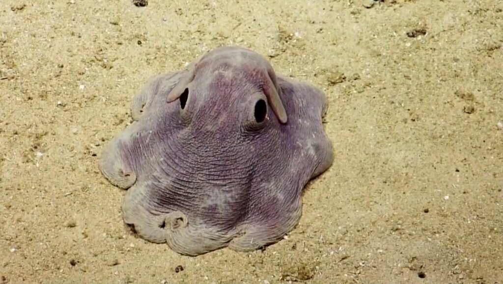 Les abysses regorgent d’animaux étonnants, et le poulpe Dumbo en fait partie. Ce céphalopode marin, dont le nom scientifique est Grimpoteuthis, évolue à plusieurs milliers de mètres de profondeur. Surnommée “Dumbo octopus” en anglais, elle doit son nom à ses nageoires latérales semblables à des oreilles.